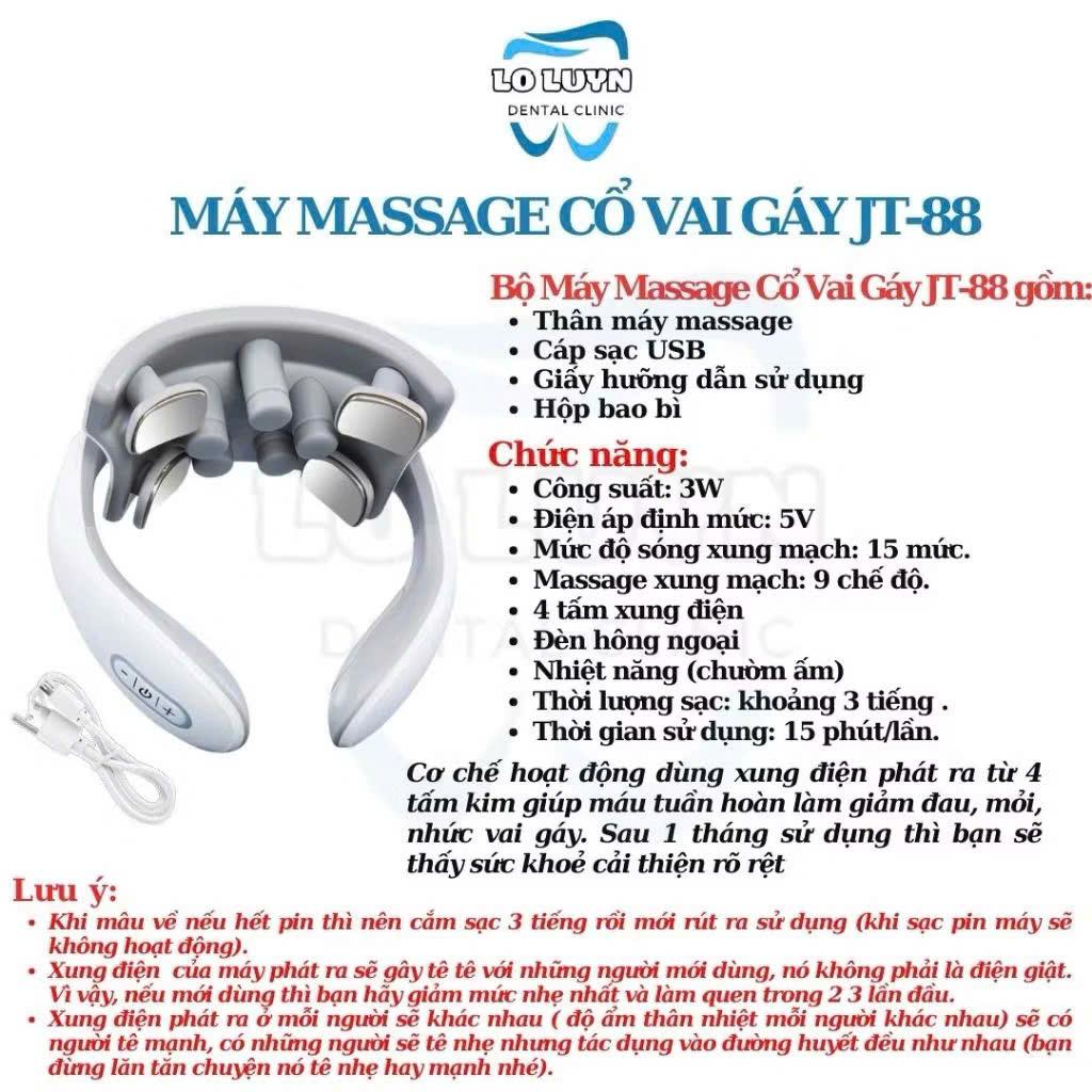 - Thời gian sử dụng liên tục: 4h (Không nên dùng liên tục tới khi hết pin vì sẽ ảnh hưởng tới tuổi thọ của pin). Máy đã được lập trình sẵn chế độ massage 10-15p sẽ tự động ngắt, sau muốn massage thêm ấn khởi động lại và massage bình thường - Thời gian sạc pin: 2h **